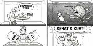 Apa tanda-tandanya jika bakteri kurang Urea/TSP? Pertama: Muncul busa putih kaku yang susah pecah di permukaan bak aerasi. Kedua: Lumpur sulit mengendap (Sludge Bulking). Kenapa bisa bulking? Karena saat nutrisi rendah, bakteri biasa (Floc forming) kalah bersaing. Yang tumbuh subur malah "Bakteri Filamentous" (bakteri benang). Bakteri benang ini rakus tapi ringan. Dia membuat lumpur jadi melayang dan keruh di outlet.Bahaya 2: Kelebihan Gizi (Overdosis)